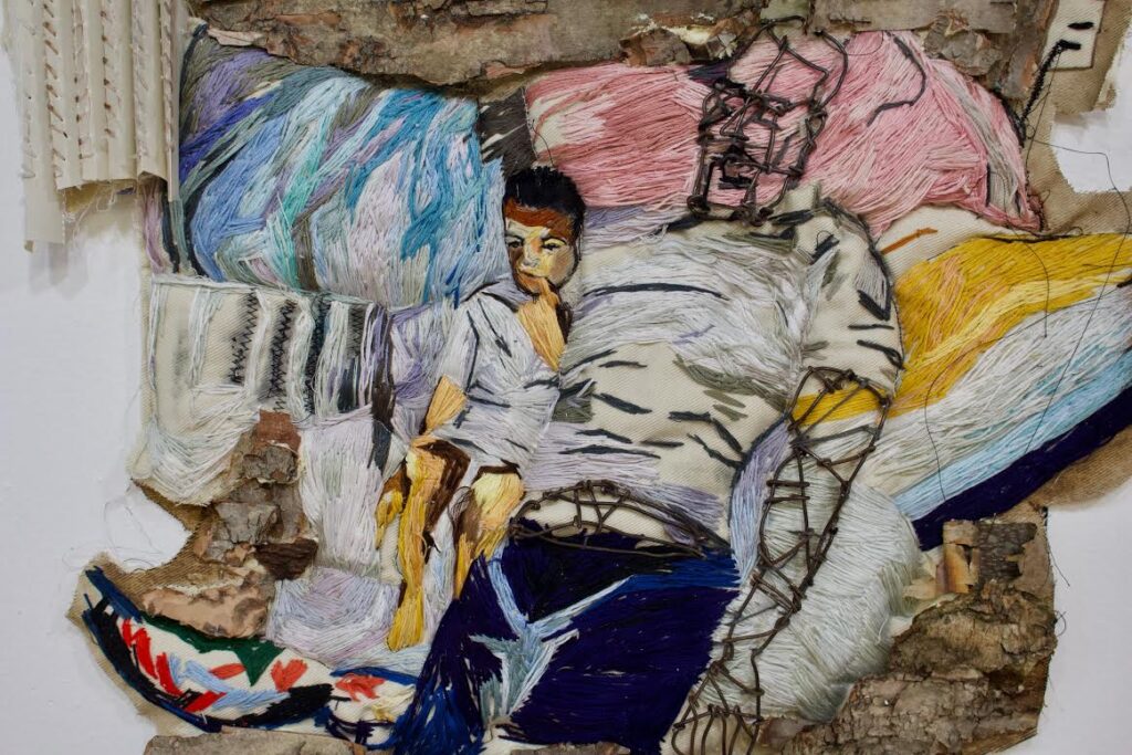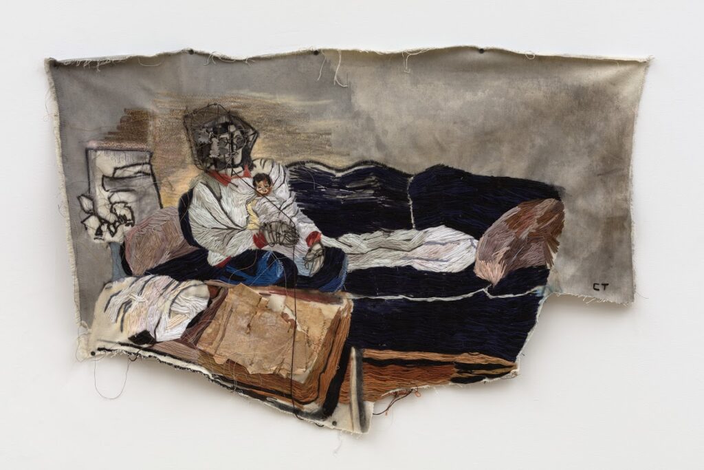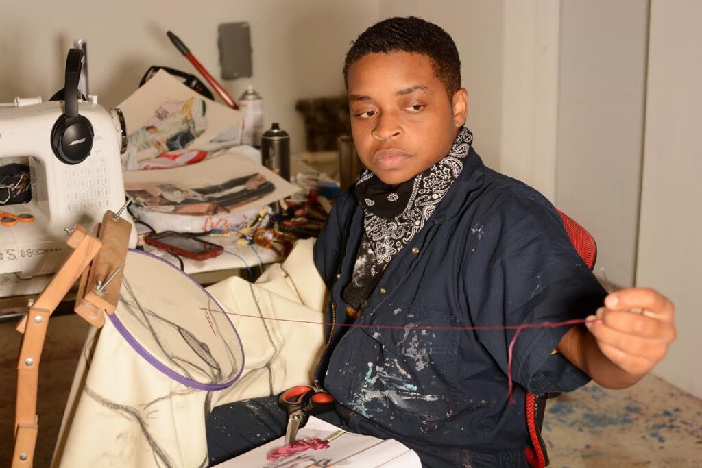 C: I’ll start with a story about my high school experience because it’s how I got into embroidery, which is always featured in my practice. I was a senior in high school when I first took art. I had a teacher who would bounce ideas off of me. One day, she showed me a book on this artist, Daryl Morrison, an embroiderer who embroidered narratives about his upbringing. He wouldn’t use image references to create them; they were more imagined and illustrative. She asked me what I’d think about assigning a project like that for the class and having each student bring in a photograph to embroider. That’s how this journey started: I brought in a photograph and was able to embroider it. I was able to do it really quickly and she assigned me to do an entire portfolio of 12 of them. I ended up applying to the Art Institute with that work. It all happened so quickly. I was accepted into the Art Institute and actually studied education instead of art. I wanted to be a teacher and create an impact on someone’s life. I ended up getting my Bachelor’s of Arts Education, so I started teaching in Chicago public schools for 3 years. I taught art full time. It was a nice experience for me, but I didn’t have a lot of time to be in the studio or a practicing artist. It’s something I always had a desire to do. I always had these creative projects and ideas for my students that came from my own interests and wanting to make art myself. I ended up leaving teaching, just to have the opportunity to express and create a body of work. For a year, I didn’t have a job. I worked in the basement creating a portfolio to apply to grad schools to study art specifically and get a master’s. I made this portfolio from 2017-2018 and ended up applying to seven different universities and grad programs. I got into all of them except for one. I went to Skowhegan using the same portfolio. It was so crazy because I didn’t have a lot of exposure to art. I was mainly focusing on education and psychology—so I didn’t get a lot of that background. When I went to Skowhegan, it prepped me for being in a program like Yale. It exposed me to readings and artists that I was super unfamiliar with that actually helped to inform my practice when I started grad school at Yale.