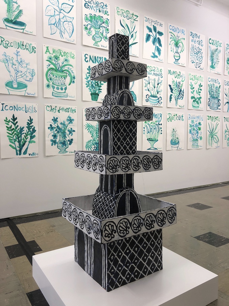 EK: I have known the artist Tabboo! for a long time and liked his paintings. I went on a trip to Rome and Naples with my friend Jacob Robichaux (who founded the gallery Gordon Robichaux with Sam Gordon, and represents Tabboo!). We went to the Naples Archaeological Museum, which is filled with the Roman frescoes removed from Pompeii. I have done several site-specific wall paintings for exhibitions, and Jacob and I started wondering what Tabboo! would do if he painted a mural. We dreamt up a show that would have a room with Tabboo!’s colorful wall painting on one side and a room with my black and white wall painting on the other side. I made the two fountains for the longer, rectangular space between the rooms, in front of a wall that was covered with Tabboo!’s blue/green drawings of plants with words. It was our version of a Roman garden. Jacob helped me construct styrofoam models to get the proportions right for the fountains. Then I made them, which took a few months.