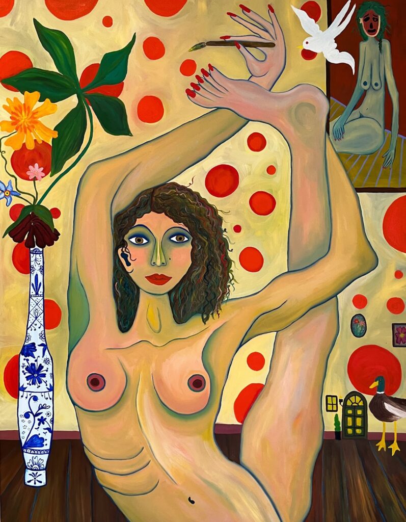 NB: Can you tell us about the way you portray the female body in your paintings and the characters that surround it, like the rabbits, the babies, wolves, and spiders?