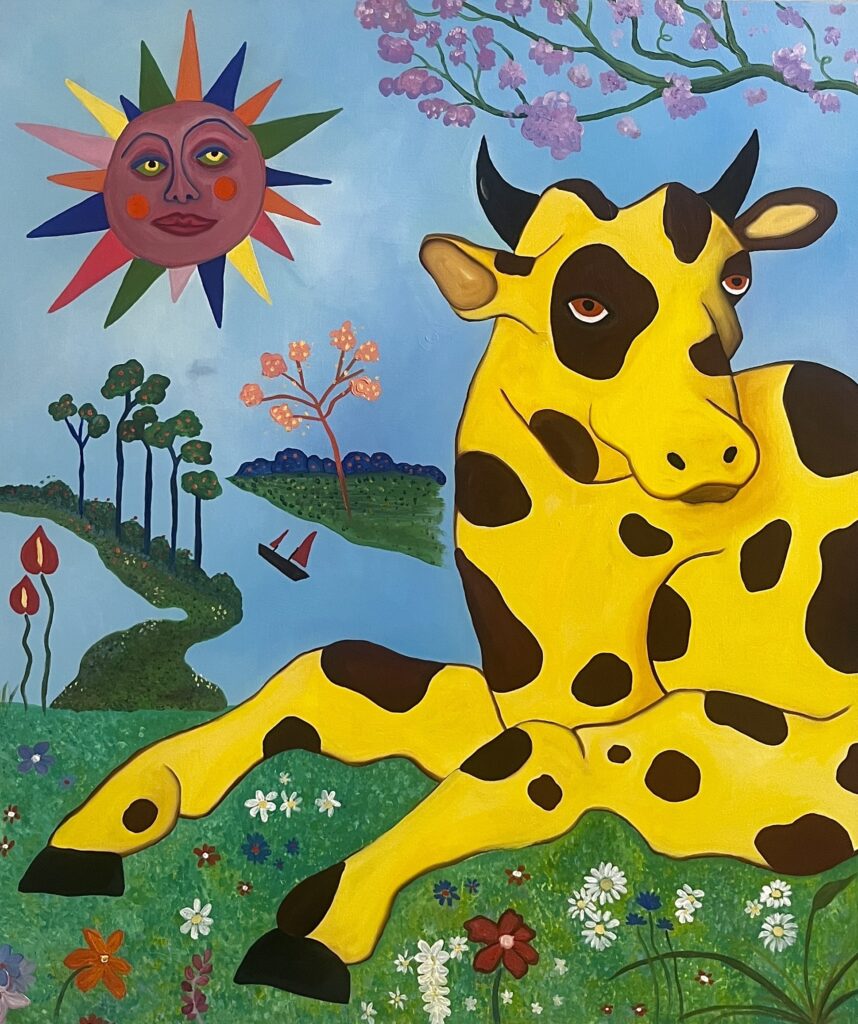 I think storytelling is really what my work is rooted in. Each piece is sort of its own ‘fable’. The story unfolds as I move through the canvas and build out these characters and the world they live in. I don’t always know where I’m going. It almost feels like working with a block of clay, you’re taking things out and then you’re putting things back in, there’s a push and pull to the painting. I’m surprised by it sometimes, just as much as the viewer. The paintings, moreso the figures, reveal themselves as I keep painting, I often feel as though I’m under their lead.