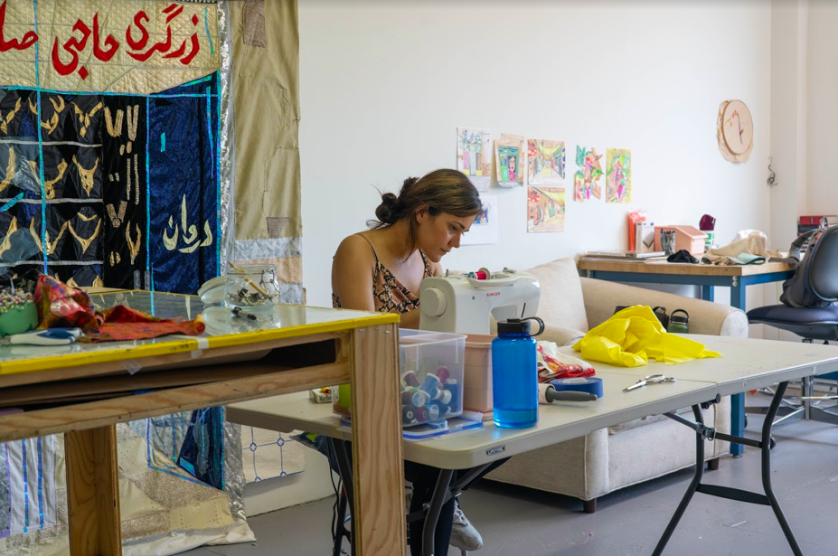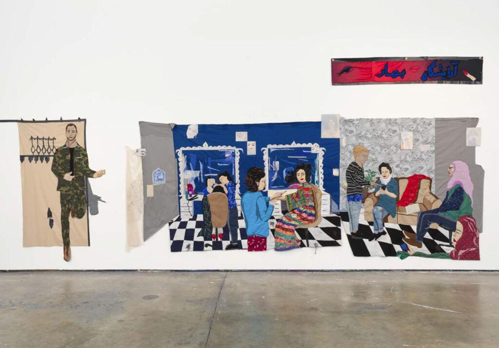 I am really excited about my solo show with T293 Gallery in Rome starting November 21st. The title of the exhibition is called “Bazaar: A Recollection of Home”. It’s pretty much reminiscing a bazaar environment in fabric, and this environment comes from my childhood memories of growing up in the bazaar. I’m pretty much transforming this space with the things that I’ve seen in the bazaar. The objects that I’ve seen are the objects that I relate to, specifically because when I was young, I always used to go to the bazaar with my aunts and with my Mom. We also used to go to the tailor shop and many clothing stores. Again, beauty salons, nails salons. So, these were the spaces where women would spend their leisure time on Friday or the weekends. Remembering back, that space tells a lot about time, politics, and history. Back then it was pre-Taliban and I could still witness that there weren’t many businesses owned by women. It was still a very male-dominated public space. Comparing that to my recent visits to bazaars, it actually has changed. I’ve seen so much hope in the voices of women. This space has transformed, and these women attract more women, business-women. They have beauty salons under their names. So for me, in this solo exhibition, I’m creating a space that women feel they belong to, which is the bazaar. The bazaar is a space in Post-Taliban society that women still don’t feel that they belong, a part of the public space. But for me in this exhibition, I’m creating an environment where women are the most important thing, with their voices, images, and names being written loudly.