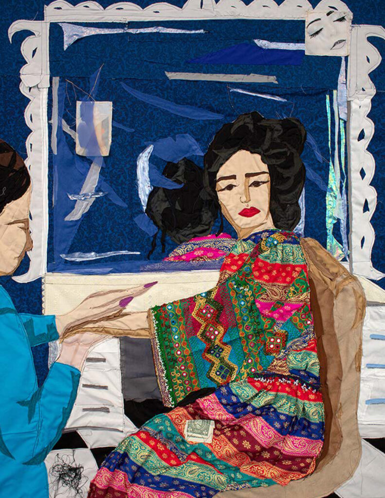 The medium of my choice is textile. I call them “textile art” pieces because the fabrics that I’m using aren’t just fabrics in shopping malls or in fabric stores, but they are geographically specific. They’re not only from the garment district of New York City, but from Afghanistan, Pakistan, India, and Tajikistan. It’s really important for me to choose my fabrics specifically based on their context and culture.